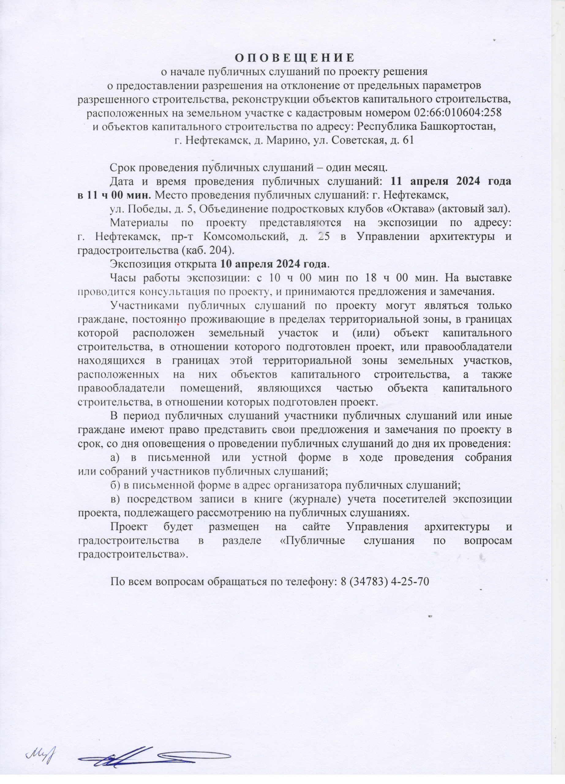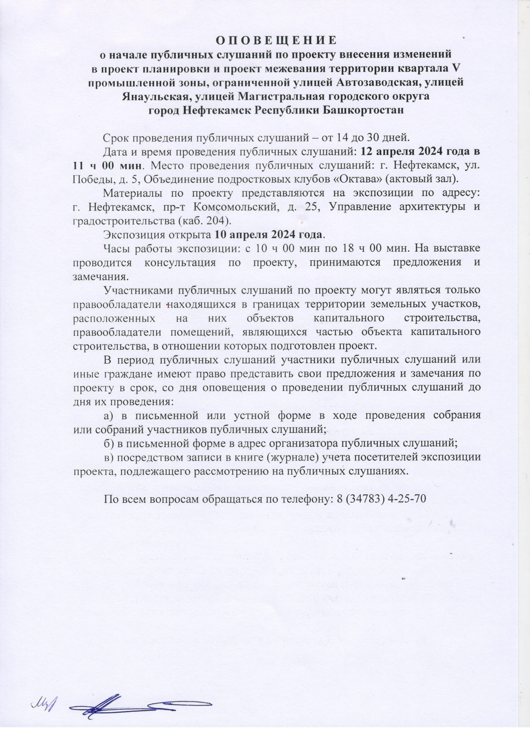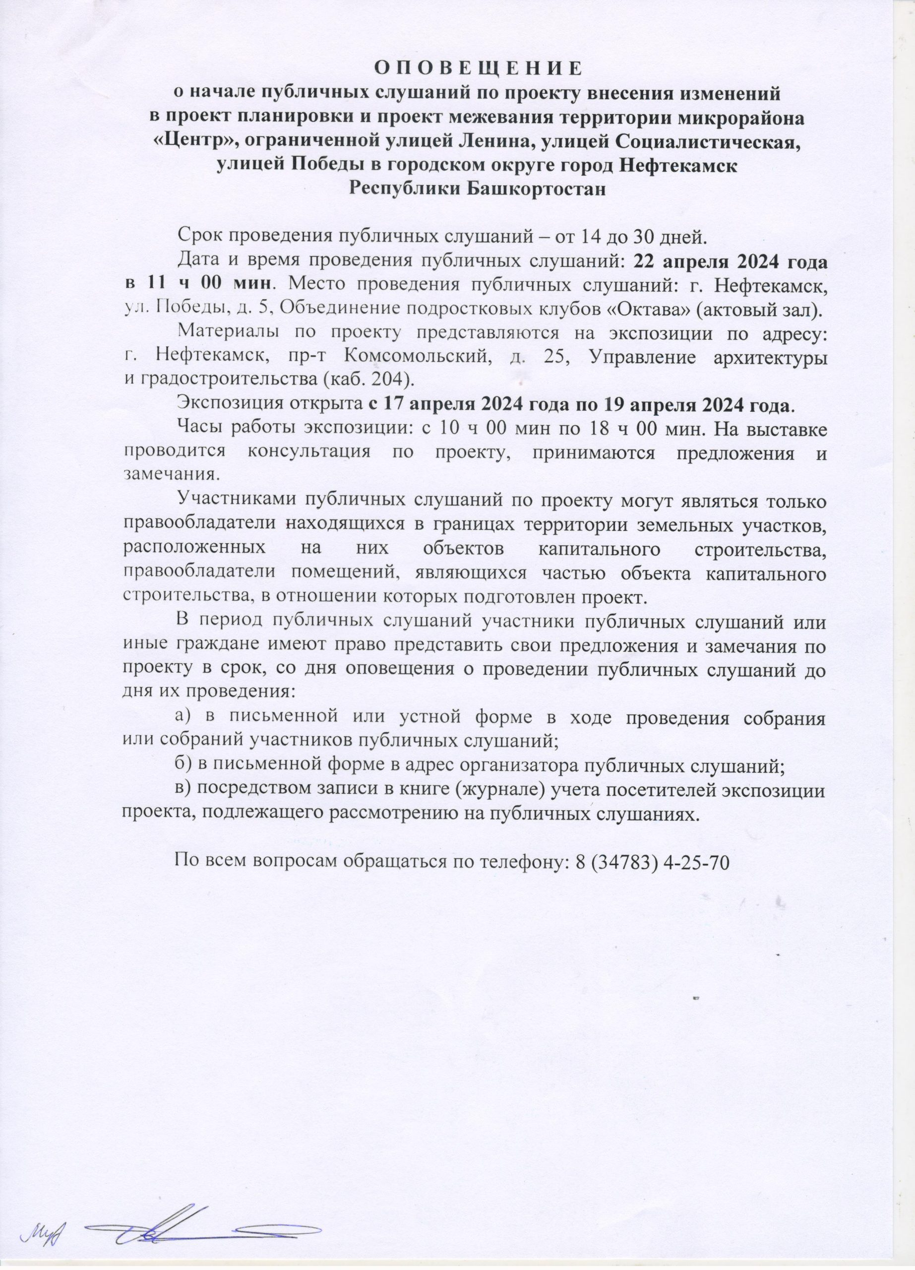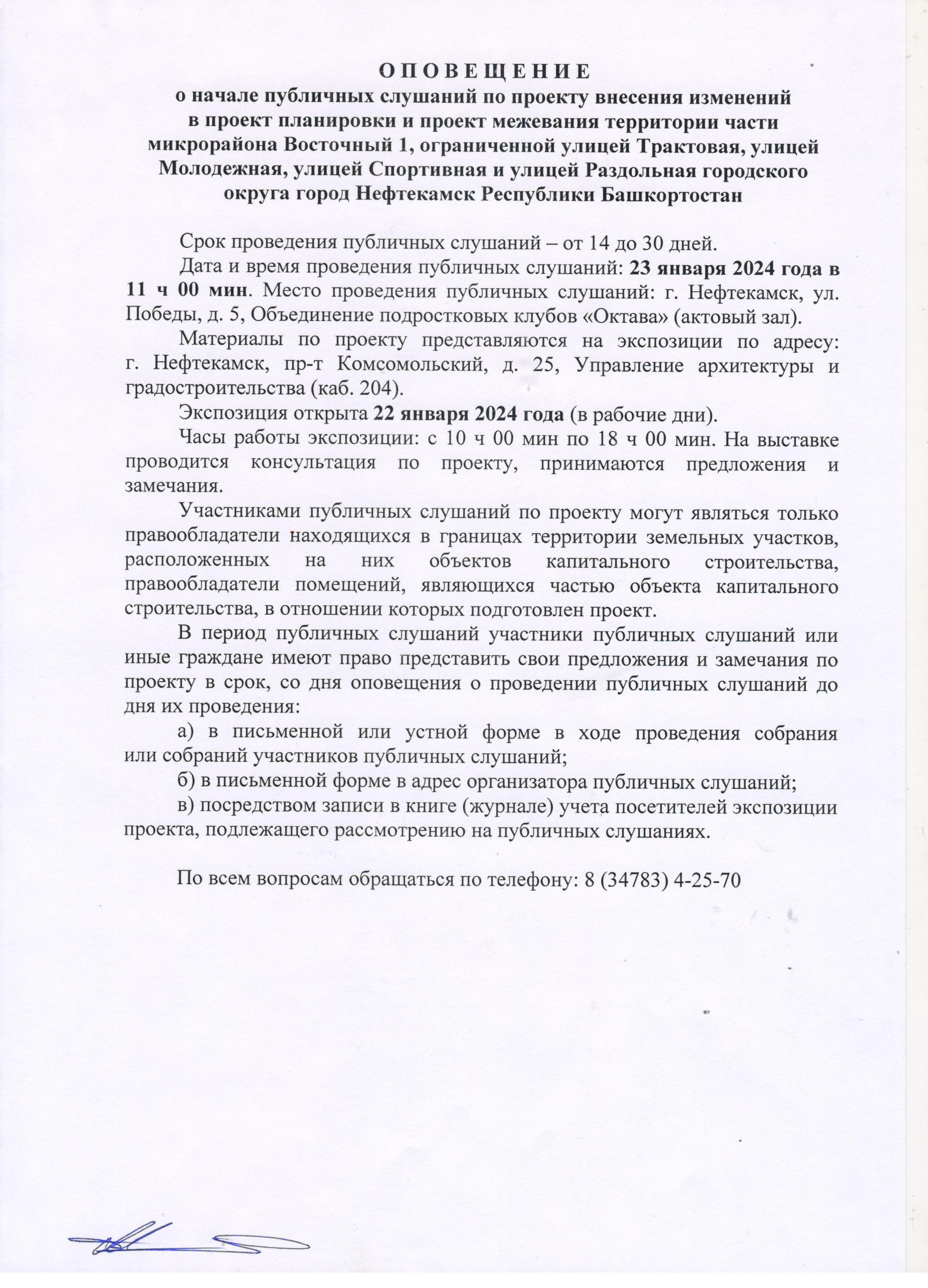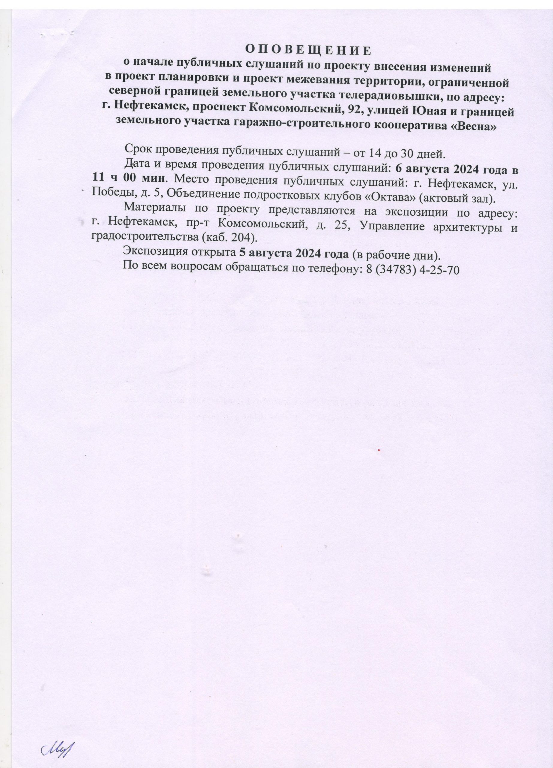 О П О В Е Щ Е Н И Е О начале публичных слушаний по проекту внесения изменений в проект планировки и проект межевания территории, ограниченной северной границей земельного участка телерадиовышки, по адресу: г. Нефтекамск, проспект Комсомольский, 92, улицей Юная и границей земельного участка гаражно-строительного кооператива «Весна»